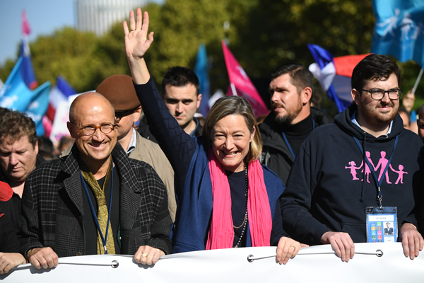 Ludovine de La Rochere, president of the anti-gay marriage movement La Manif Pour Tous (Protest for Everyone) gestures as she attends a demonstration organised by the movement 'La Manif pour tous' against what are seen as 'new offensives against the family and education' in Paris on October 16, 2016. Photo: Eric FEFERBERG / AFP